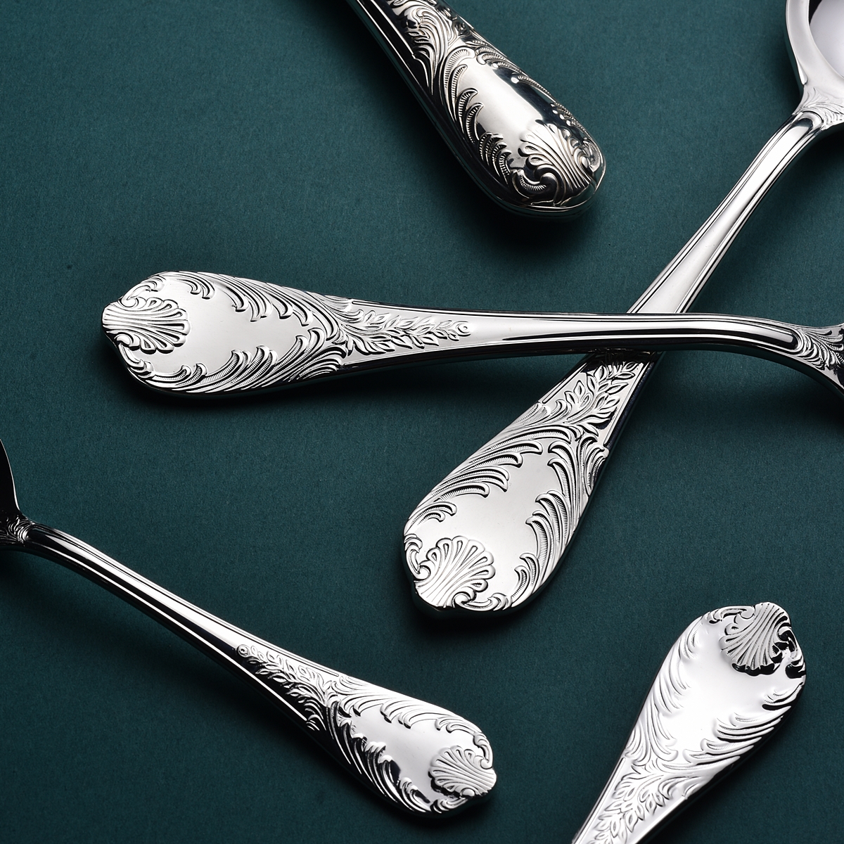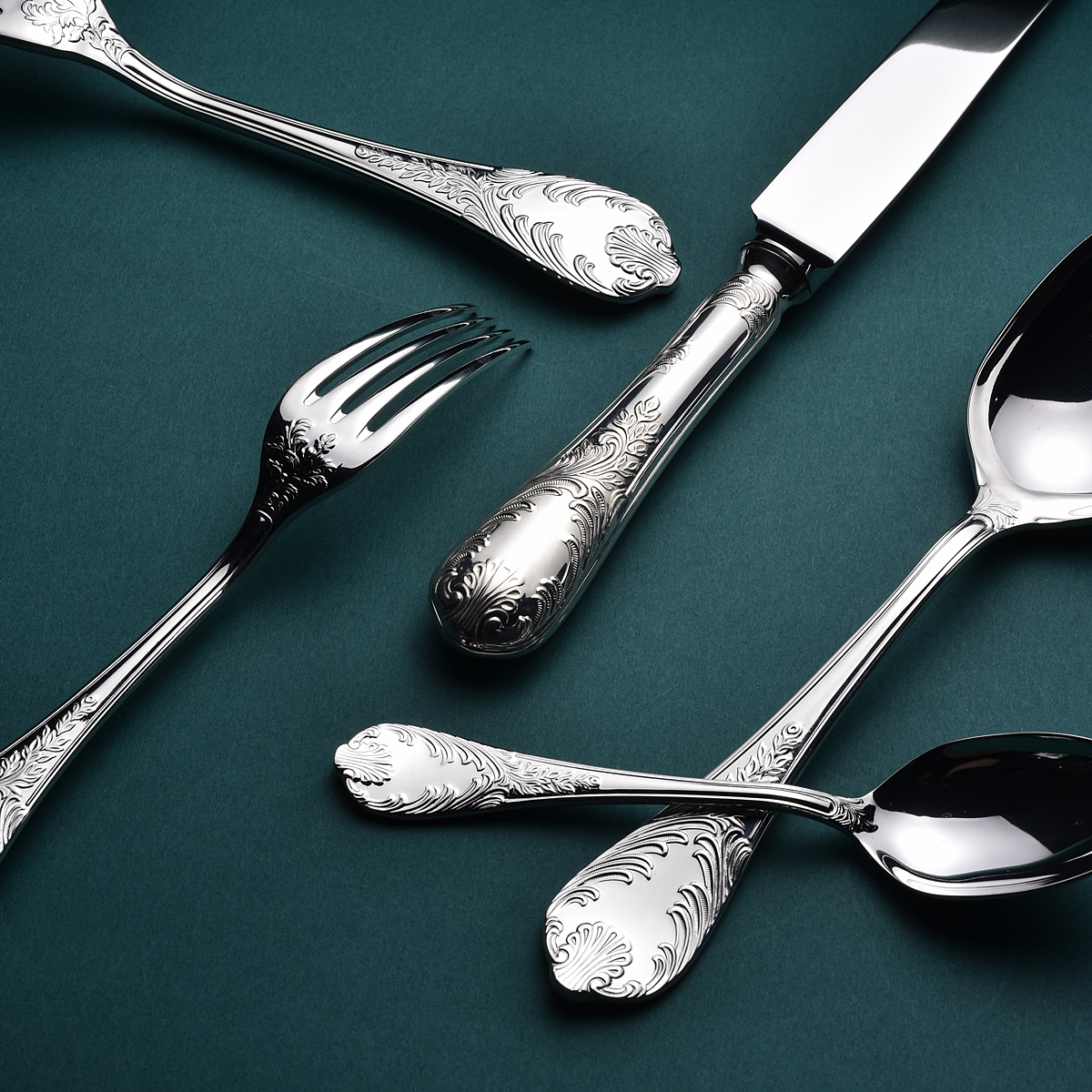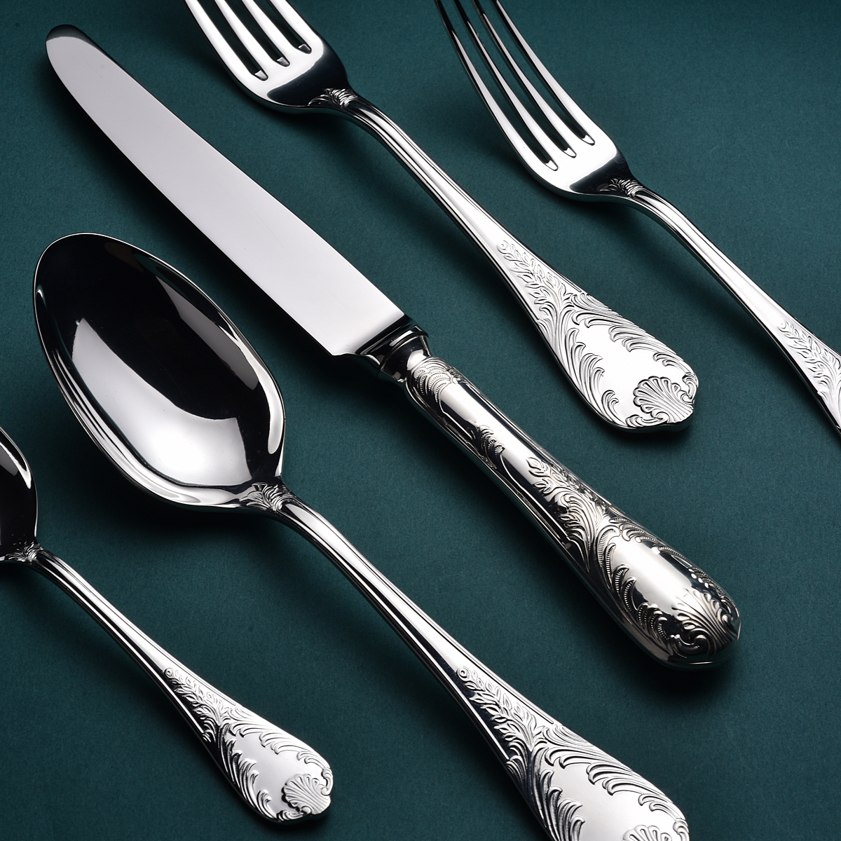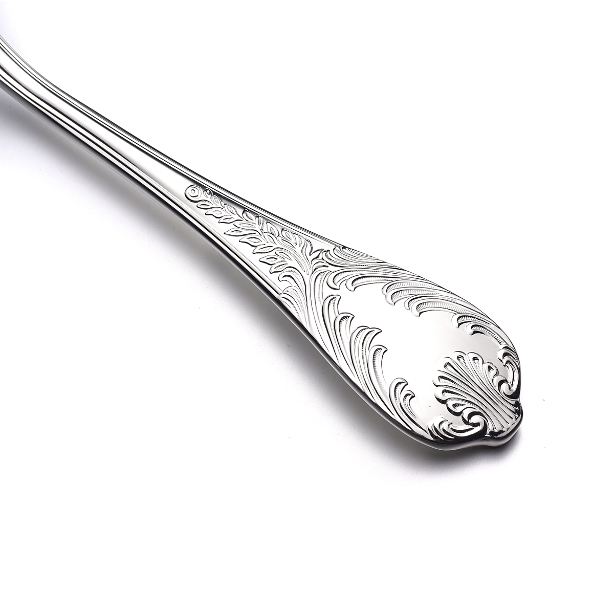 Our exquisite line of traditional French Louis XV style silverware, meticulously crafted to embody the opulence of the era. Each piece features intricate ornaments of delicate plants and elegant shells adorning the handles, evoking the sophistication of 18th-century French design.